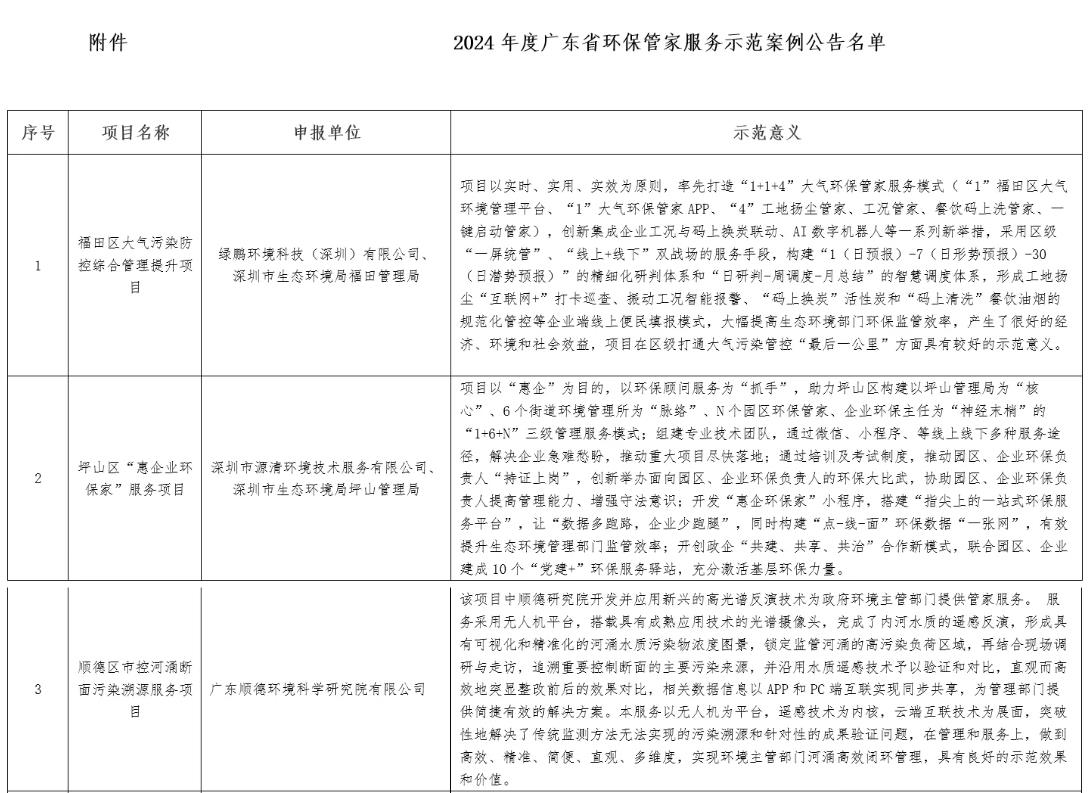 近日,廣東省環(huán)境保護產(chǎn)業(yè)協(xié)會公布了“2024年度廣東省環(huán)保管家服務(wù)示范案例”名單,我司承接的“乳源瑤族自治縣生態(tài)環(huán)境保護委員會辦公室環(huán)保管家服務(wù)項目”成功入選。
